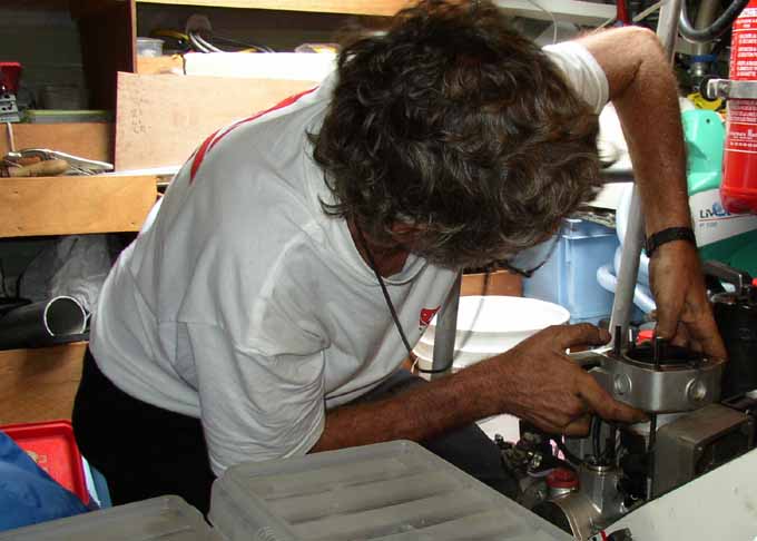 Le 07 juin 2003, nous quittons le port de Keehi à Honolulu par 21°Nord. A 14 heures, il fait 31,5°C dans le bateau. Nous avons envoyé la grand voile et le génois léger. En prévision de coup de vent possible plus au nord, nous avons échangé notre foc de route habituellement monté sur l'enrouleur pour une voile plus petite. Pour les vents légers, nous installons sur l'étai largable le génois léger. On contourne l'île de Oahu par l'ouest. Arrivés à la pointe Barbers, le vent tombe complètement. Nous nous dégageons de la pointe au moteur et on remonte le long de la côte ouest . Les prévisions météo ont annoncé des vents très légers pour toute la zone. Aussi, on s'attend à utiliser pas mal le moteur, le temps de bien se dégager des îles. Ce sera seulement le 10 juin que nous retrouverons les alizés réguliers de Est Nord-est de 15 à 20 noeuds, à la hauteur des 25° Nord. Le ciel perturbé laisse la place à une grande étendue de ciel bleu avec quelques petits cumulus sans grains. Notre vitesse moyenne est de 7 noeuds. Comme le vent est régulier, nous pouvons brancher notre régulateur d'allure qui a le gros avantage de ne pas consommer d'électricité puisqu'il ne comporte que des pièces mécaniques. La température va diminuer progressivement et à14 heures, le 14 juin nous n'avons que 26°C à l'extérieur. Nous prenons encore nos douches à l'extérieur ! La mer et le vent resteront réguliers pendant plusieurs jours. Peu de cargos croisent notre route, souvent d'est en ouest. La veille reste primordiale de nuit comme de jour.