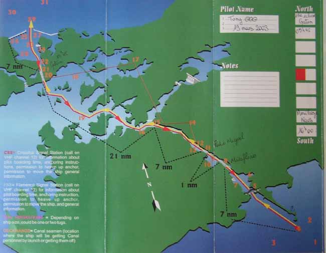 Nous trouverons les amarres et les équipiers parmi les voiliers du mouillage. Notre passage est prévu le 19 mars 2003, arrivée du pilote à bord à 4h30 du matin !!!! Nous achèterons 5 pneus pour compléter nos pare battages. En fait, cela parait rapide expliqué comme cela, mais cela nous prendra une semaine pour tout faire. La banque fermait à 14 heures, nous y sommes arrivés à 14h05 ! Le lendemain, impossible de payer avec la carte bancaire car la banque procède au retrait des fonds, et non pas à un paiement comme chez un commerçant. Il a fallu contacter notre banque en France pour demander une augmentation du plafond de retrait en espèces. Trois jours d'échange par Internet : chose impossible. Retour à la banque et on paie une partie en espèces et une partie dans la limite du plafond de la carte. Notre stress monte au fur et à mesure que le jour approche.