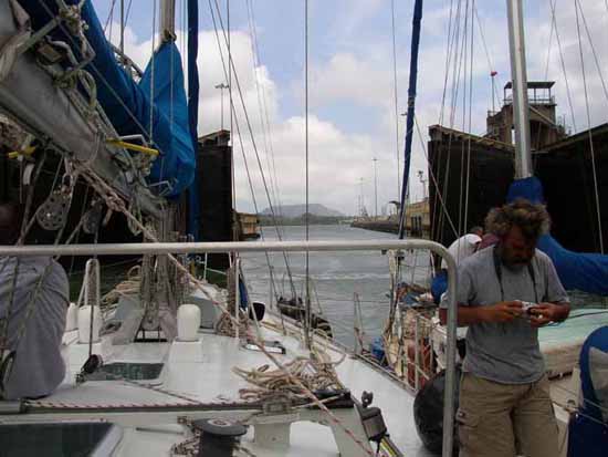 Les cargos sont reliés aux berges des écluses par quatre énormes locomotives de 45 tonnes qui glissent sur des rails. Elles suivent le bateau dans sa progression. Les lamaneurs lancent au voilier une amarre avec au bout une pomme de touline permettant un lancer de précision. Nous aurons cependant protégé de cartons les panneaux solaires, et arrêté l'éolienne. Les voiliers et les remorqueurs sont reliés à terre par leurs amarres qui sont déplacées d'une écluse à l'autre par ces même lamaneurs. A notre tour, dés notre arrivée à Colon, nous nous attelons aux démarches administratives. Nous contactons le bureau de l' "Admesurement". Un fonctionnaire vient mesurer le bateau, ce qui détermine le montant de la taxe de passage du Canal (nous passerons dans la classe des plus de 50 pieds : 850 US Dollars. Les prix ont subi une drôle d'inflation en 10 ans, nous avions payé 250 US Dollars pour 45 pieds). Nous remplirons un nombre incalculable de formulaires. Puis, le soir au Yate Clube, autour d'une bière, nous rencontrerons les équipages des autres bateaux. Chacun discute de ses projets, certains ne passent pas le canal et retournent vers les San Blas ou les Caraïbes, d'autres passent et vont sur les Galápagos puis soit Les Gambier soit Les Marquises. Nous serons deux voiliers à nous diriger vers le Costa Rica. Nous sommes deux à bord, et nous n'avons qu'une seule amarre faisant la taille requise. Nous devons trouver 3 autres amarres et trois autres équipiers. Un panaméen nous proposera de vieux pneus protégés par des sacs poubelle pour 3 USD pièce (on peut aller les chercher soi-même dans les stations services, et c'est gratuit ! quand on a la chance de trouver un garagiste qui veut bien les donner), des amarres pour 15 USD pièce, et des "handliners" (lamaneurs en français) pour 50 USD chaque par jour (si on passe le canal en 2 jours, doublez la mise !!!).....